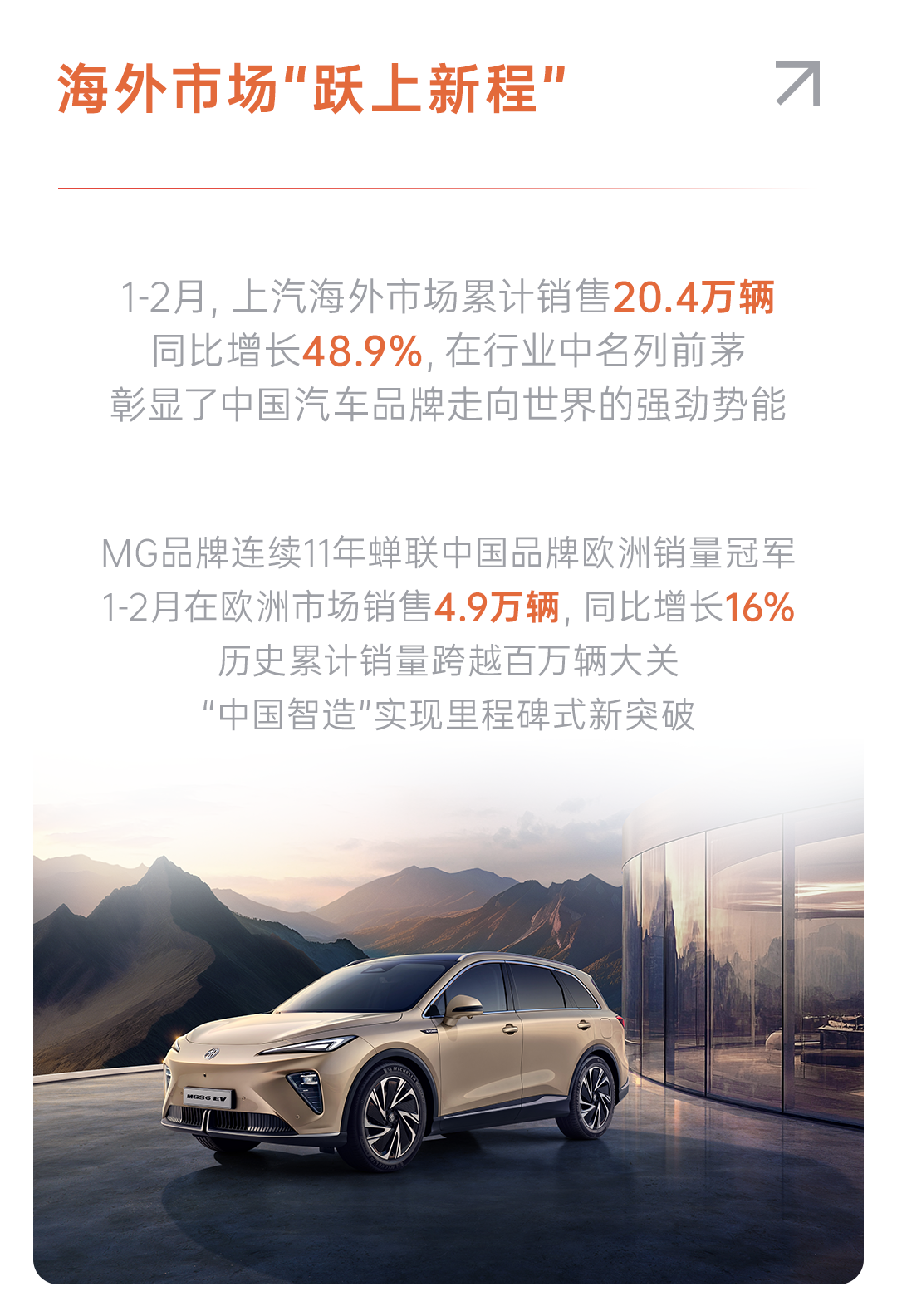 2月销量26.9万辆,1-2月累计销量。保有量59.7万套,同比增长6.8%。在一月份取得良好开局后,他们继续稳居榜首。尤其是自主品牌正在经历快速增长。 1-2月,上汽乘用车销量同比增长44.8%,赤机汽车销量同比增长69.4%。合资品牌复苏趋势明显,上汽通用汽车销量同比增长9.4%。上汽集团深化改革创新、加快转型现代化,自主品牌、新能源、海外业务持续推进,展现了上汽集团的韧性和高质量发展潜力。今年,上汽自主品牌销量达到40.1万辆,同比增长14%,占集团销量的67.2%,提升4.3个百分点。一年后売は13万9000台で、前年同期比増加した44.8%。上汽大通 330亿美元 4.4% 上汽自主品牌多点开花、长足发展的格局已经形成,为上汽整体增长奠定了坚实的基础。今年2月,上汽新能源汽车累计销售15.7万辆,同比增长6.4%,巩固了行业领头羊的地位。高端品牌表现突出。智基LS6の累计出荷台数が10万台を突破しました。 1月から2月にかけて、上海汽车乘用车は新エネルギー车を5万台贩売し、前年相似比334.7%増加した。 MG4の月间贩売台数は5か月连続で1万台を突破。上汽マクサsuは7.0 00台の新エネルギー车を贩売し、前年比11.6%増加した。新エネルギー车の贩売台数は9,000台で、前年比216.9%以上増加しました。上汽GM五菱は7万台の新エネルギー车を贩売し、福ァーウェイ乾坤技术を搭载した“华晶S”试验车正式下线,继续强化上汽在智能卡车领域的发力。国外市场正在“跃上一个新台阶”。今年1-2月,上汽汽车海外市场累计销售20.4万辆,同比增长11.4%。同比增长48.9%,位居行业前列,彰显了中国汽车品牌全球化扩张的强大潜力。 MG品牌连续11年蝉联中国品牌欧洲销量冠军。 1-2月,欧洲市场销量4.9万辆,同比增长16%。迄今为止累计销量已突破100万台,标志着“中国智造”新的里程碑。市场覆盖五大洲的智机汽车全球扩张迈出重要一步,正式进军阿联酋、突尼斯市场,标志着智机汽车在中东、北非的战略布局进一步深化。 2026年上半年,上汽集团新产品矩阵加速推进。全新荣威等多品牌、多产品的系列重磅新车蓄势待发i6、名爵新能源轿跑车、智际LS9超级版、智际LS8、尚捷Z7、上汽通用五菱华景S、上汽大众ID.ERA 9X、上汽奥迪E7X、上汽通用智境E7。细分市场产品矩阵为上汽集团实现市场新突破、推动经营业绩持续提升提供了有力支撑。