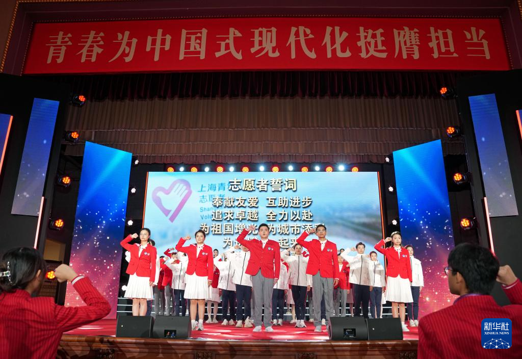 10月29日拍摄志愿者宣誓仪式。10月29日,第八届中国国际进口博览会志愿者宣誓仪式在上海展览中心友谊厅举行。志愿者的职责包括提供现场指导和咨询、管理展会报名、协助新闻宣传、统计商业数据、提供健康医疗支持等。据报道,过去七届进博会期间共有 34,000 名志愿者参与了这项服务。新华社记者 刘英 供图