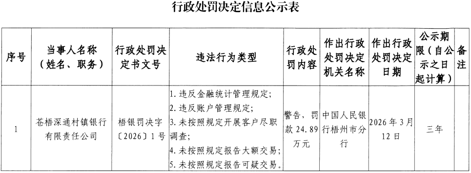 中国经济网北京3月18日电 中国人民银行广西壮族自治区分行近日公布了行政处罚决定信息公开表(五银行决字[2026]1号)。这表明苍梧金通村镇银行股份有限公司违反了金融统计管理规定。违反账户管理规则。未按照规定进行客户尽职调查。未按照规定报告大额交易的。我们已按照规定报告可疑交易。中国人民银行梧州分行对苍梧神通村镇银行股份有限公司给予警告,并罚款24.89万元。天眼查显示,苍梧神通村镇银行股份有限公司第一大股东为深圳农村商业银行股份有限公司,持股比例为74.8%。原文如下。